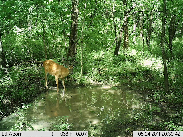 I have had most of my trail cameras pulled due to the threat of flooding during this time of the year, but always left at least one out on each mineral lick to keep tabs on velvet bucks. I've been happy with what has been showing up so far, and they are just now getting to the point when you can really start seeing antler characteristics and tell what type of potential they may have for this coming season. Just recently, as the threat of heavy spring rains and flooding is diminishing, I put out some more cameras on trails...hopefully I will get some more velvet bucks and more exciting pictures. I've always enjoyed true "trail" pictures more than "bait" pictures.